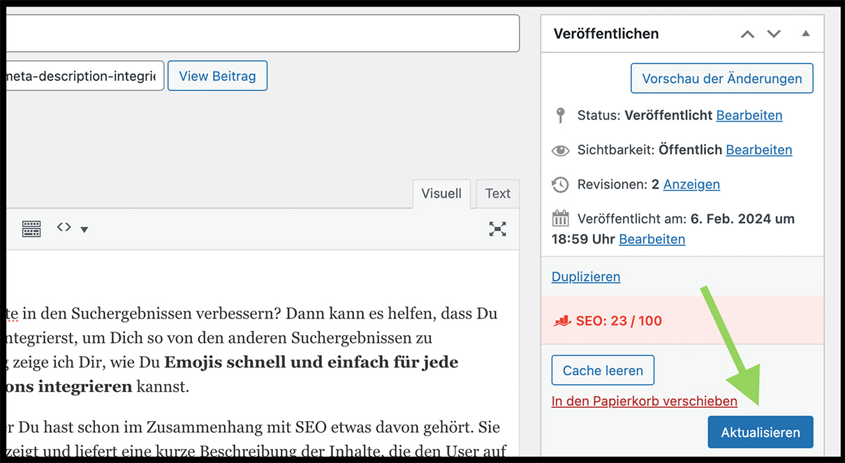 Im letzten Schritt speicherst Du die Änderung noch, indem Du rechts oben in Deinem Beitrag auf „Aktualisieren“ klickst: