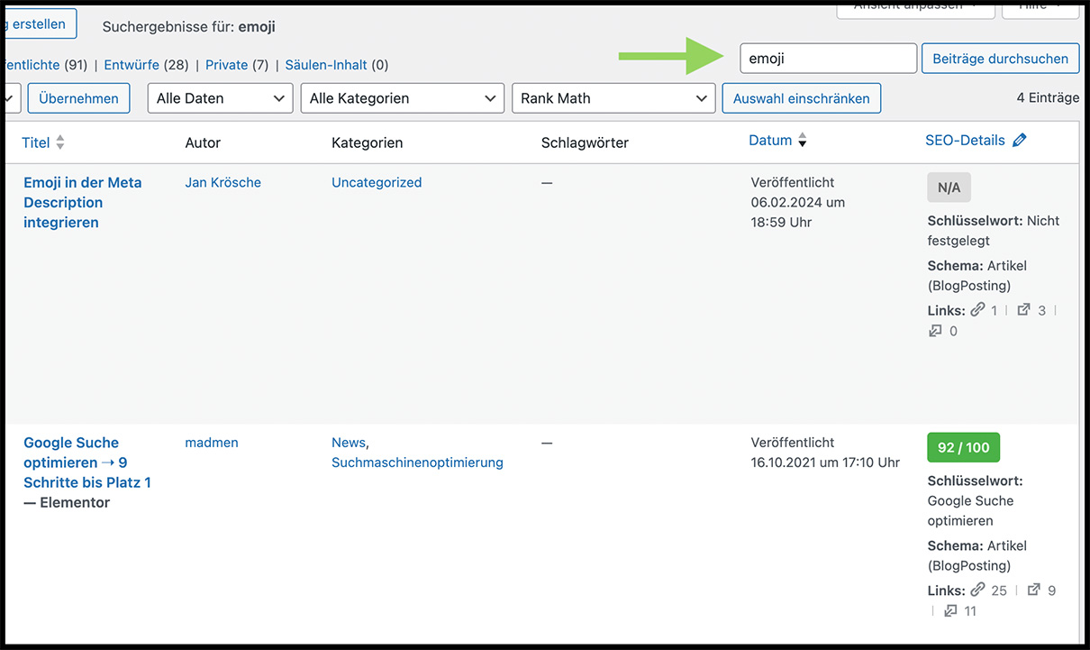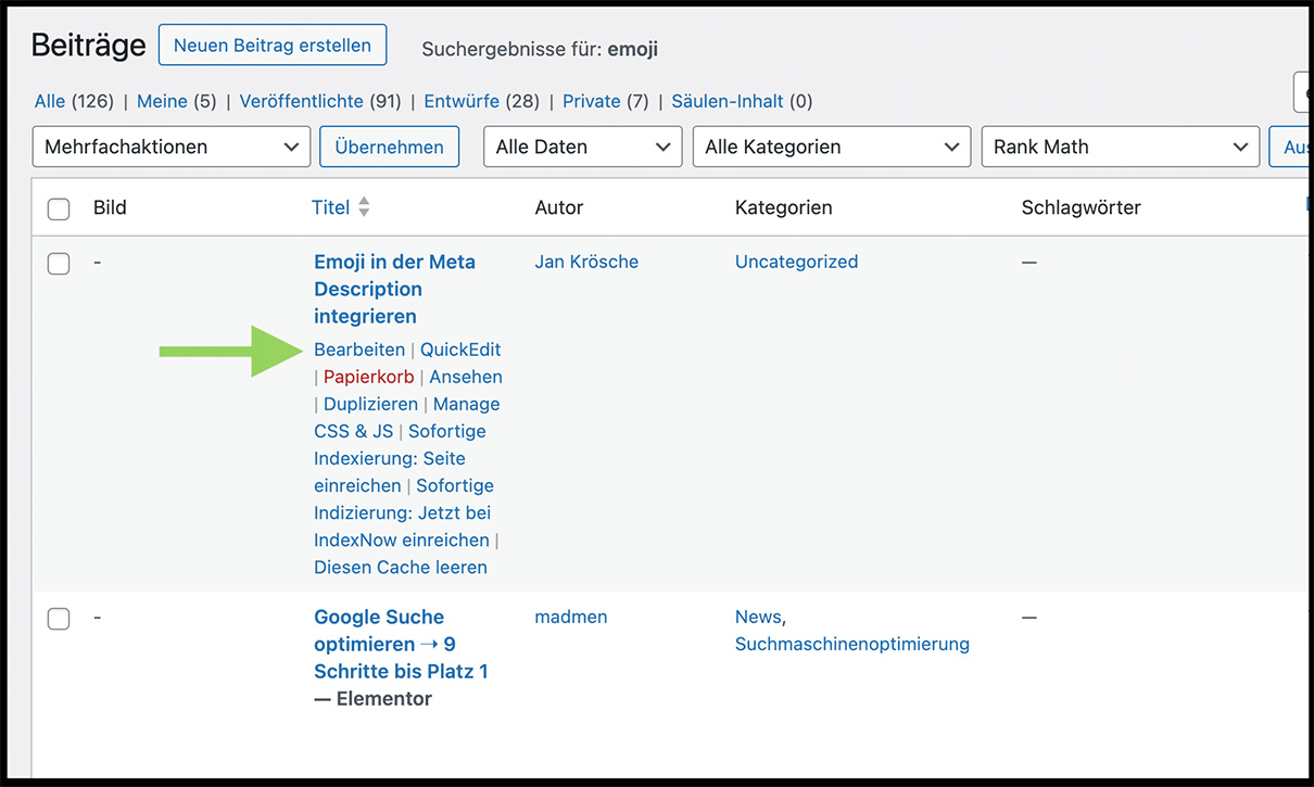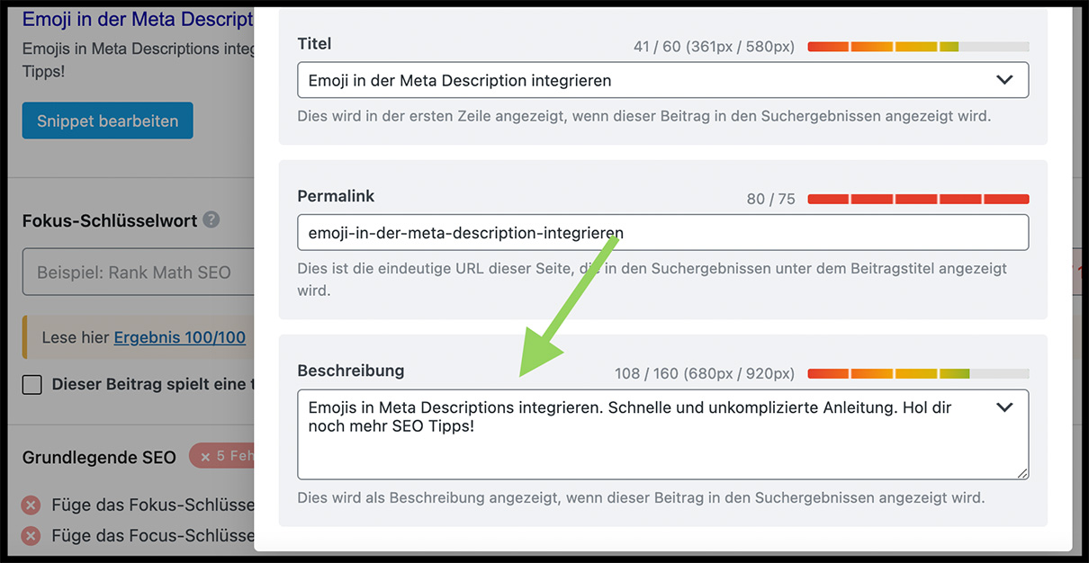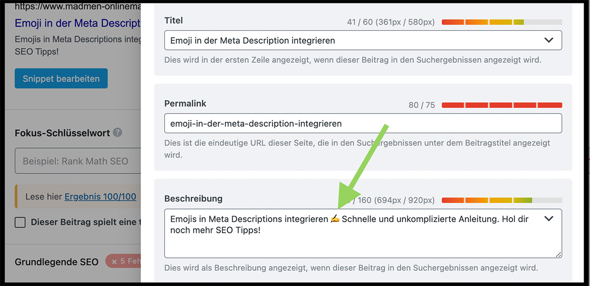 Jetzt kannst Du wieder zu Deinem WordPress-Tab wechseln und das Emoji in den Text der Meta Description an der gewünschten Stelle einfügen: