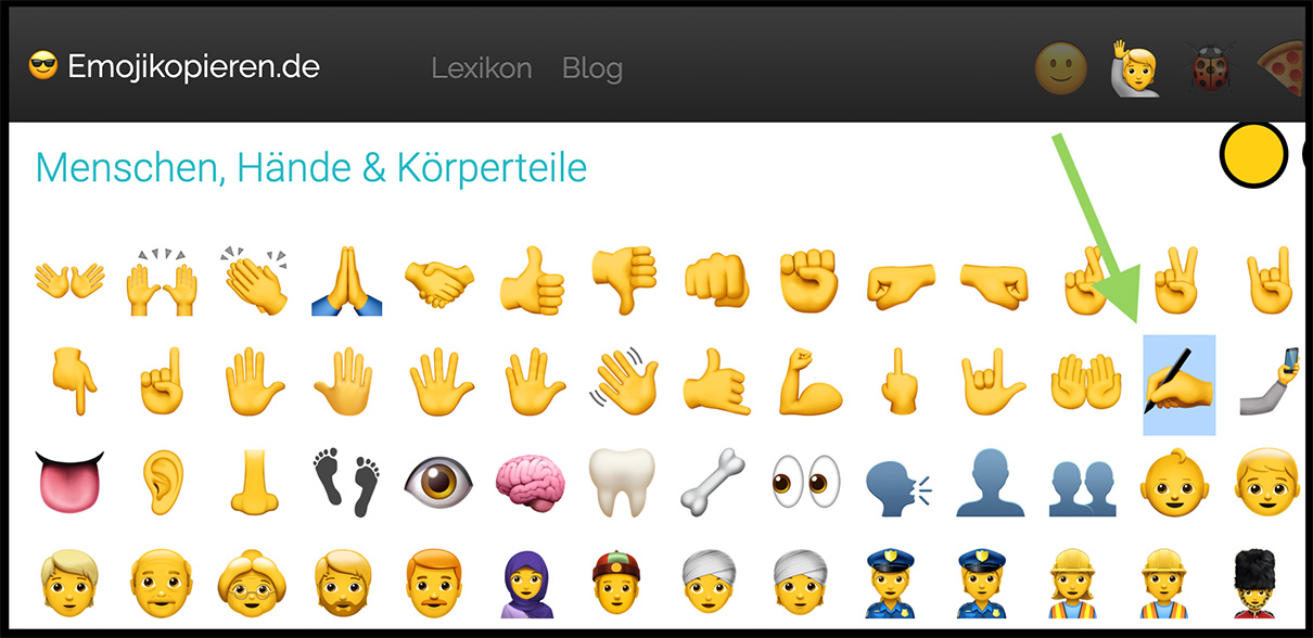 Jetzt öffnest Du in Deinem Browser einen neuen Tab und suchst Dir eine Seite, auf der Du Emojis kopieren kannst, zum Beispiel diese hier: https://emojikopieren.de/. Markiere das entsprechende Emoji und dann kannst Du es kopieren: