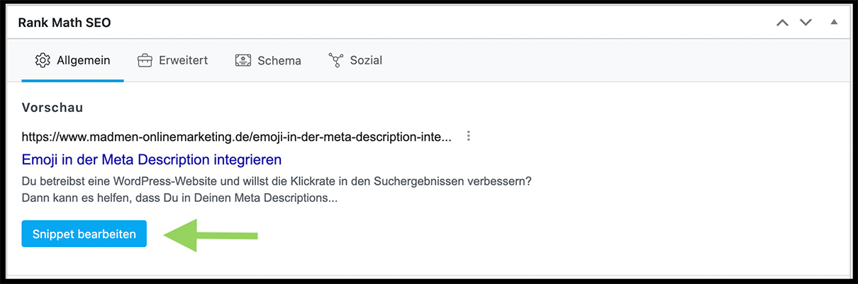 In unserem Beispiel wird das Plugin „Rank Math SEO“ für die Anpassung von Title Tags und Meta Descriptions verwendet. Du kannst aber auch jedes andere SEO-Plugin (z.B. YOAST oder SEOPress) verwenden. Klicke einfach auf den entsprechenden Bereich, in dem Du die Meta Description ändern kannst: