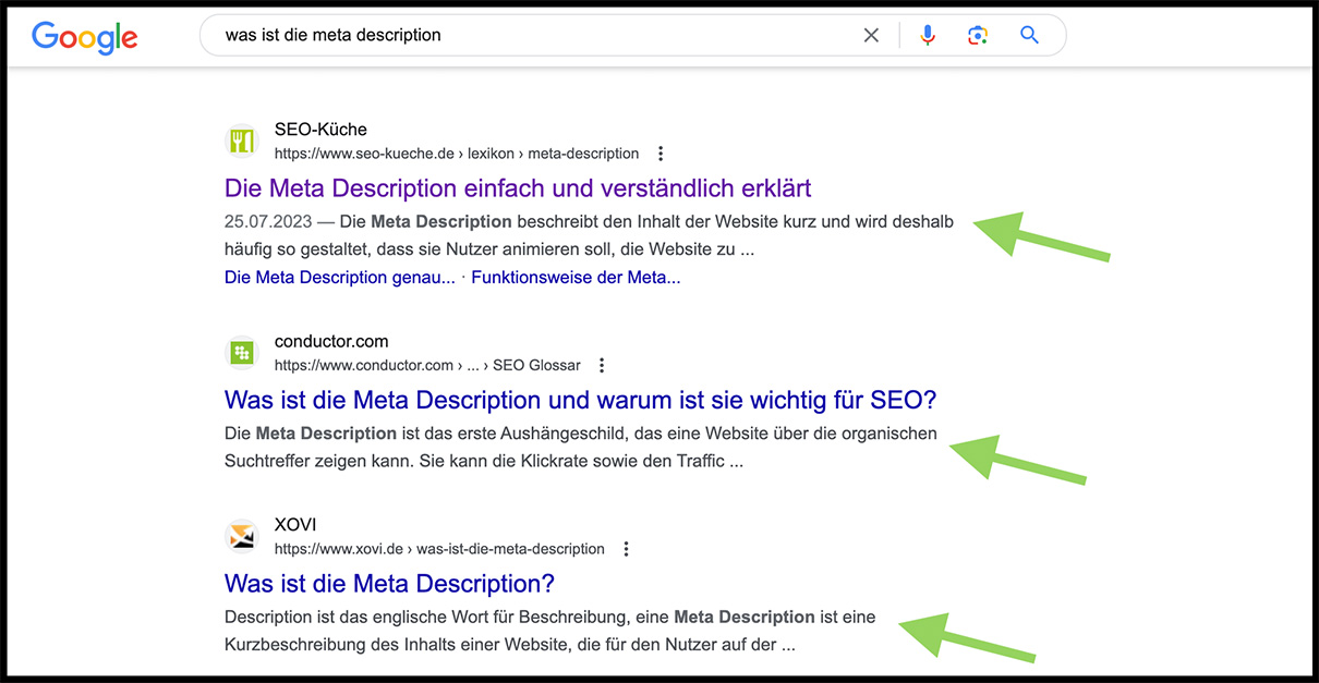 Was die Meta Description ist, weißt Du sicherlich schon oder Du hast schon im Zusammenhang mit SEO etwas davon gehört. Sie wird in den Suchergebnissen unter dem Titel der Seite angezeigt und liefert eine kurze Beschreibung der Inhalte, die den User auf der Landingpage erwarten: