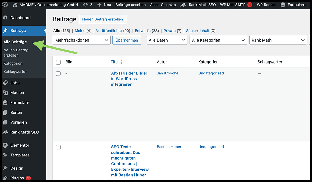 Wenn Du Dich erfolgreich bei WordPress angemeldet hast, befindest Du Dich nun im Backend Deiner Seite. Bevor Du die URL in WordPress ändern kannst, musst Du zur richtigen Landingpage navigieren. Je nachdem ob du die URL einer Seite oder eines Beitrags ändern möchtest, wählst du den Menüpunkt links in der Navigation aus. Seiten sind meistens die Landingpages, die im Menü Deiner Website verlinkt sind. Beiträge werden oft für einen Blog- oder News-Bereich genutzt. Ich zeige Dir die Anpassung der URL anhand eines Beitrags. Bei einer Seite funktioniert es aber genauso. Du klickst also links im WordPress Menü auf „Beiträge“ und dann auf „Alle Beiträge“.