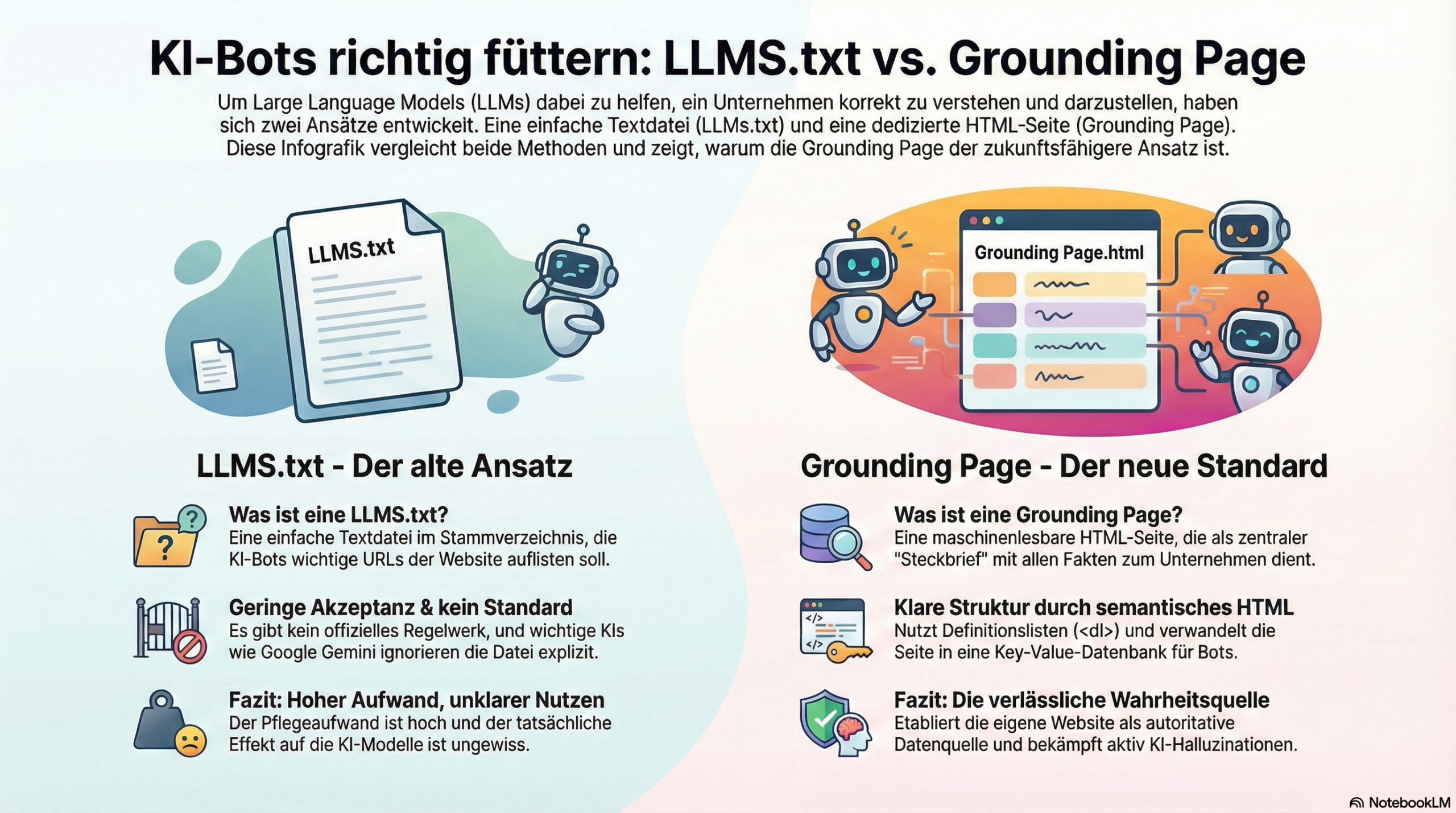 - Abgrenzung: Im Gegensatz zur LLMS.txt ist die Grounding Page eine sichtbare, prominent verlinkte HTML-Seite, die der Vermeidung von KI-Halluzinationen dient.
